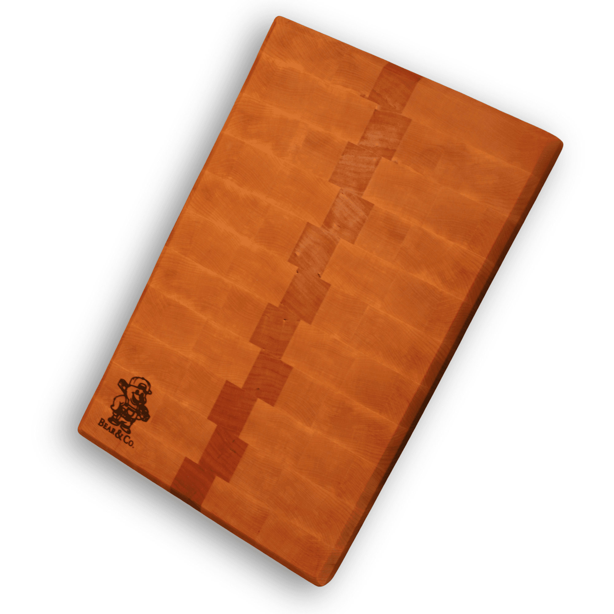 Maple and Cherry end grain cutting board with a juice groove and chamfered edges.