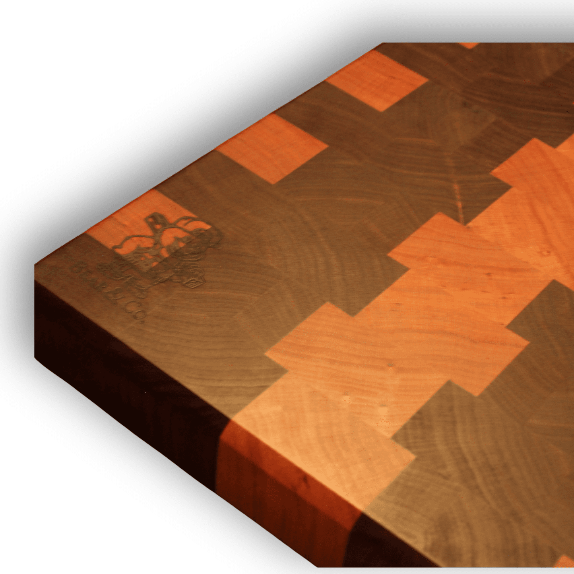 End grain cutting board made of maple and cherry wood and sanded to buttery smooth with a juice groove and chamfered edges.